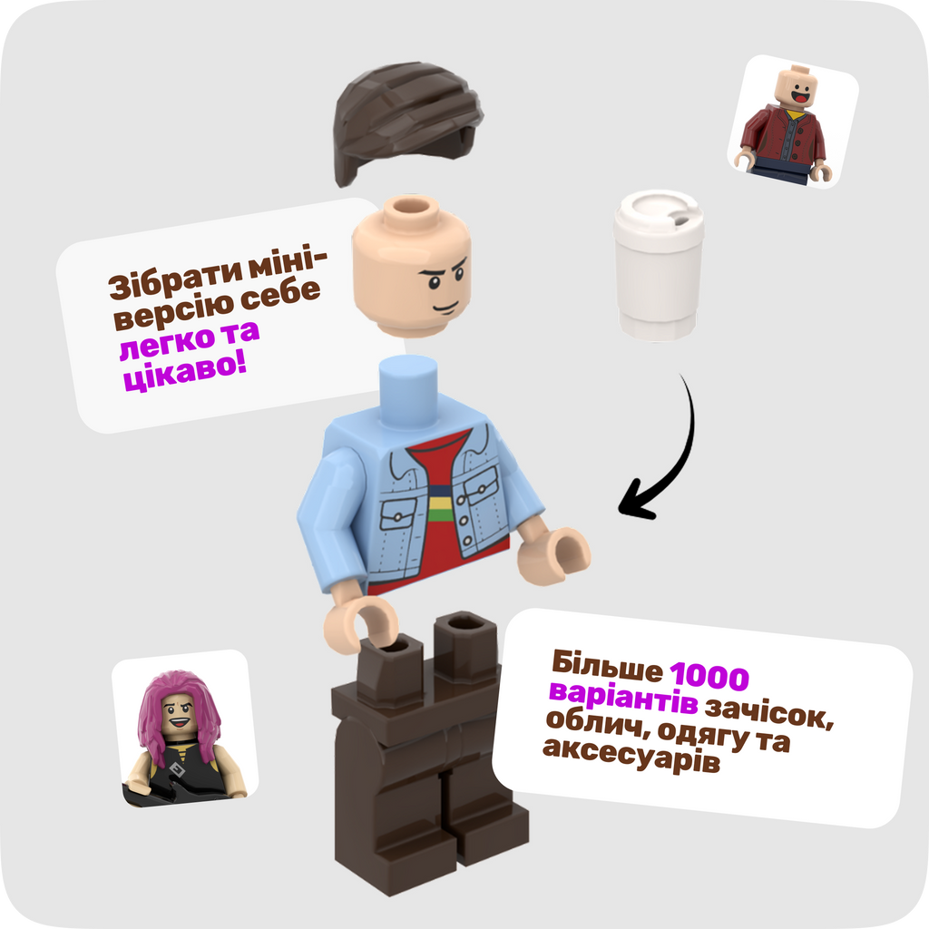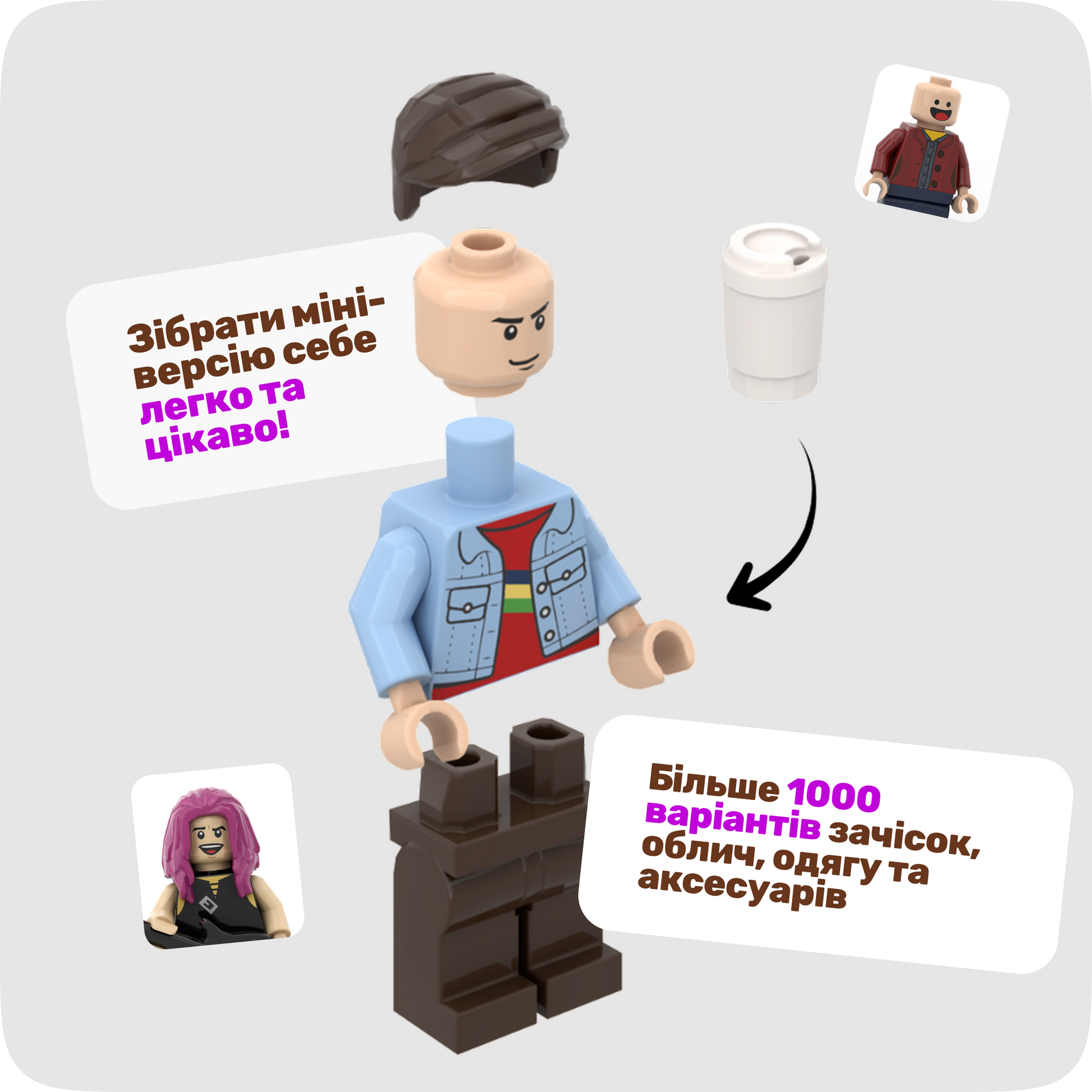 Понад 1000 комбінацій облич, зачісок, одягу та аксесуарів. Створи фігурку, схожу на себе або близьку людину.